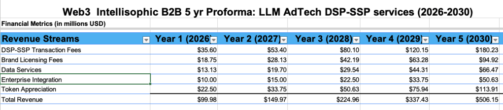 Assumptions: LLM 47.5B Monthly transactions Ad placements strat at 2.8% in Year 1 incresing to 9.5% of global LLM transactions in 2030.